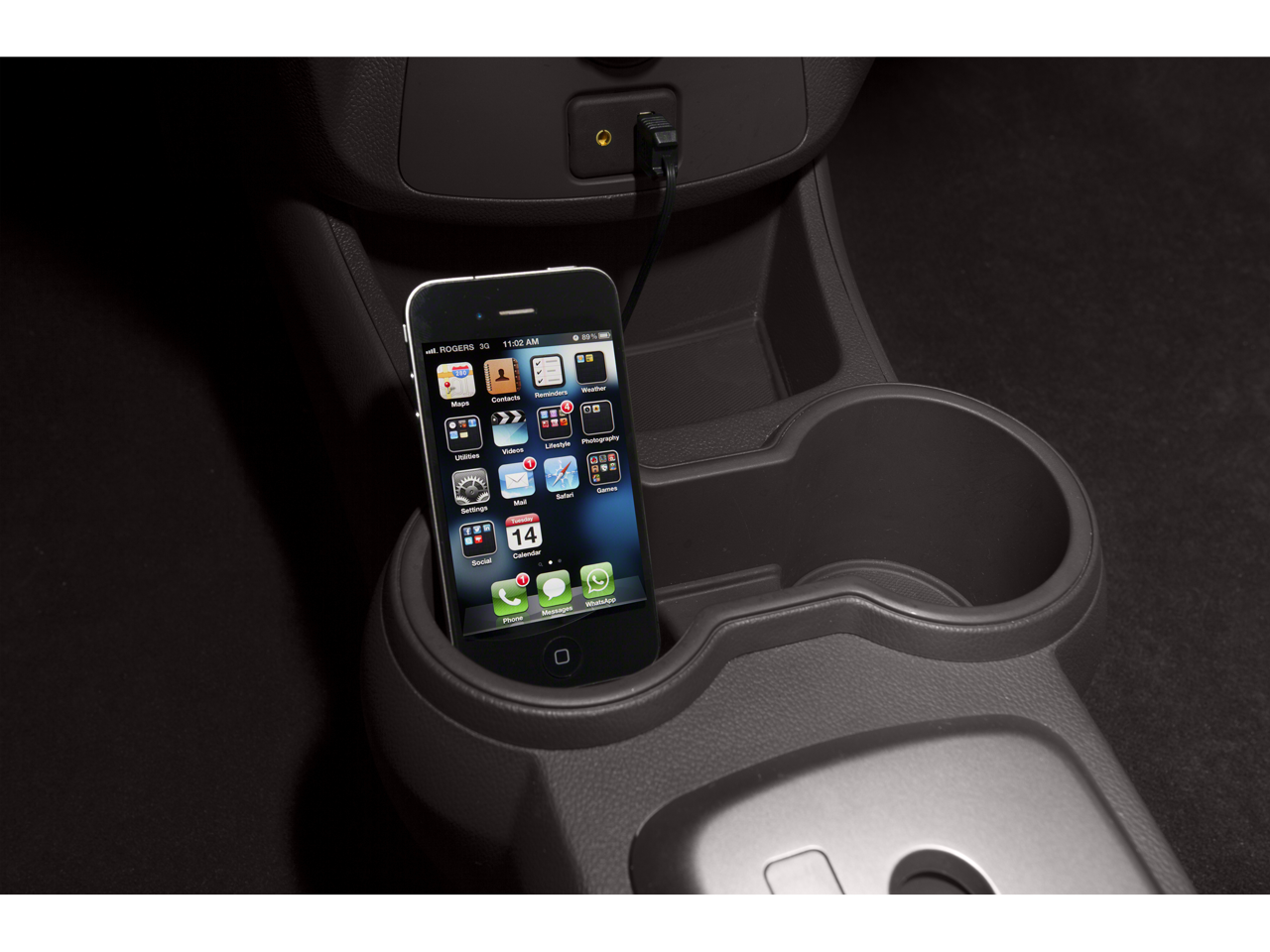 - Audio system feature, USB port and auxiliary input jack located in front center stack storage bin